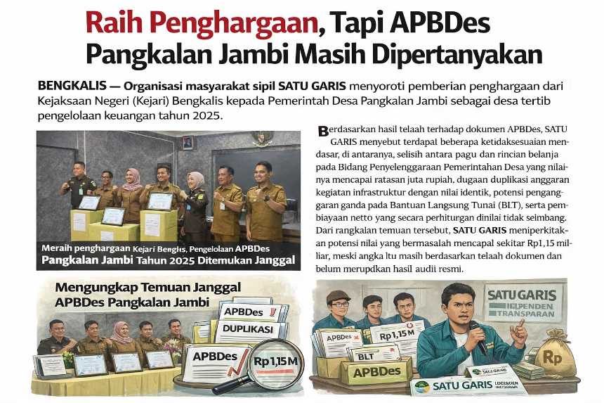 Detikxspost – BENGKALIS — Organisasi masyarakat sipil SATU GARIS menyoroti pemberian penghargaan dari Kejaksaan Negeri (Kejari) Bengkalis kepada Pemerintah Desa Pangkalan Jambi sebagai desa tertib pengelolaan keuangan tahun 2025. Menurut SATU GARIS, penghargaan tersebut dinilai tidak sejalan dengan sejumlah kejanggalan yang justru ditemukan dalam dokumen Anggaran Pendapatan dan Belanja Desa (APBDes) Tahun Anggaran 2025.