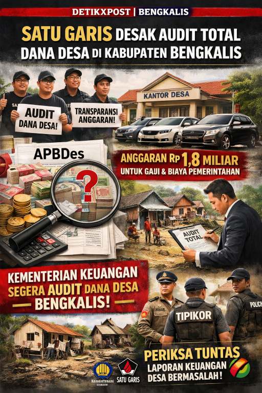DetikXPost – Bengkalis ; Organisasi gabungan aktivis dan jurnalis independen SATU GARIS mendesak Kementerian Keuangan Republik Indonesia untuk melakukan audit total terhadap pengelolaan Dana Desa di seluruh wilayah Kabupaten Bengkalis, Provinsi Riau. Desakan ini muncul menyusul banyaknya laporan keuangan desa yang dinilai tidak transparan, janggal, serta minim dampak nyata bagi kesejahteraan masyarakat desa.