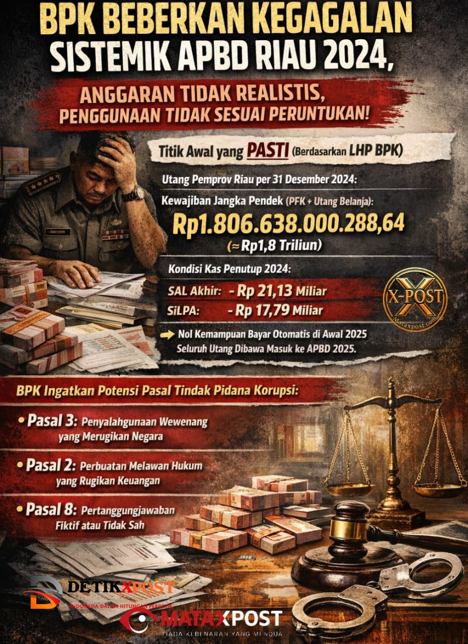 DetikXPost – Pekanbaru : Berdasarkan Laporan Hasil Pemeriksaan BPK RI Perwakilan Provinsi Riau atas Laporan Keuangan Pemerintah Provinsi Riau Tahun Anggaran 2024, kegagalan pengelolaan APBD yang berujung pada opini Wajar Dengan Pengecualian serta munculnya kewajiban jangka pendek sebesar Rp1.806.638.000.288,64 tidak dapat dipahami sebagai kesalahan teknis satuan kerja semata. Temuan BPK justru menunjukkan adanya persoalan sistemik pada simpul perencanaan, pengendalian, dan pelaksanaan anggaran yang berada di bawah kendali struktur kebijakan inti Pemerintah Provinsi Riau.(28/12).