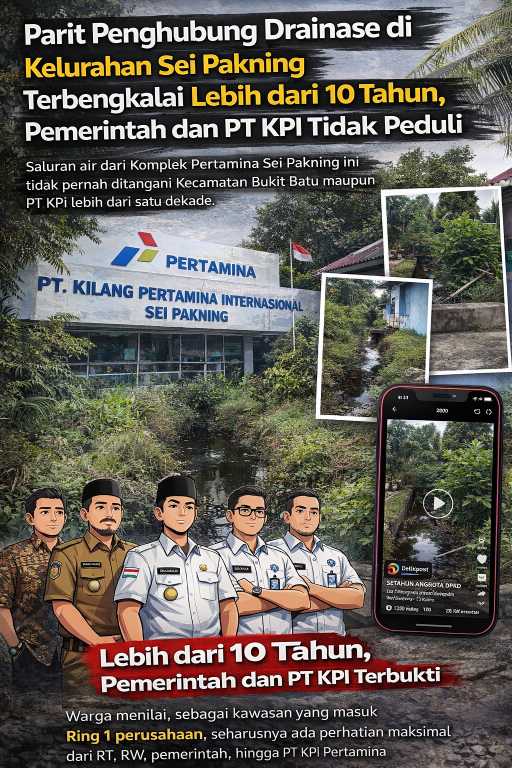 Detik Xpost  –  Bukit Batu — Kondisi saluran air atau parit di wilayah Kota Kelurahan Sei Pakning, Kecamatan Bukit Batu, Kabupaten Bengkalis, kian memprihatinkan. Parit yang berfungsi sebagai saluran penghubung aliran air dari Komplek Pertamina ke saluran pembuangan luar tersebut disebut telah lebih dari 10 tahun tidak pernah mendapat penanganan serius dari pihak terkait. 6 /1/2026