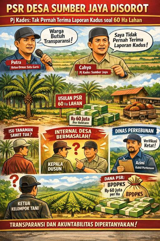 DetikXPost BENGKALIS — Program Peremajaan Sawit Rakyat (PSR) di Desa Sumber Jaya, Kecamatan Siak Kecil, Kabupaten Bengkalis, menjadi perhatian publik menyusul munculnya pertanyaan masyarakat terkait kesesuaian data dan mekanisme pengusulan penerima bantuan. Organisasi Satu Garis mendorong keterbukaan informasi guna memastikan program strategis nasional tersebut berjalan sesuai ketentuan. Ketua Organisasi Satu Garis, Husni, menegaskan bahwa langkah ini bukan bentuk tudingan, melainkan dorongan transparansi. “Program PSR menyangkut dana negara dan kepentingan petani. Wajar jika publik ingin mendapatkan penjelasan yang utuh dan terbuka,” ujar Husni, Selasa (1/2/2026).
