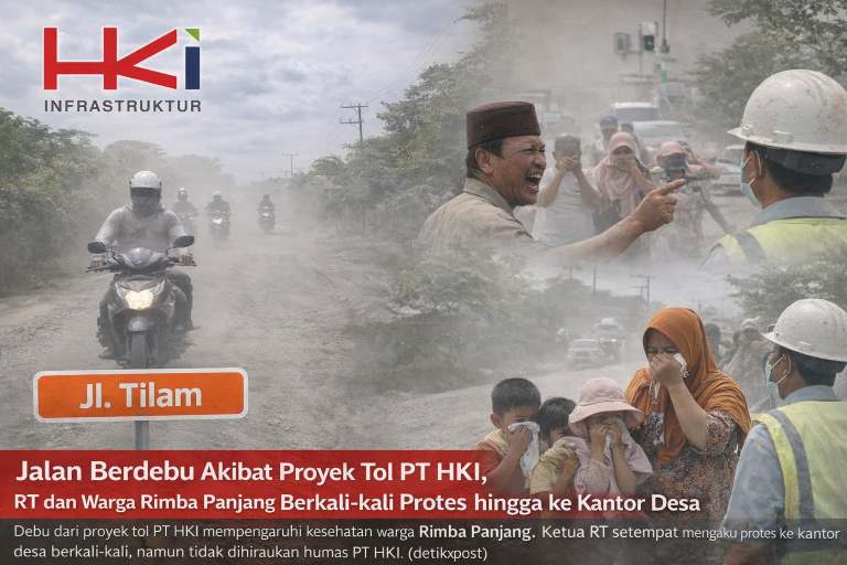 Detikxpost | Kampar — Dampak pembangunan jalan tol yang dikerjakan oleh PT Hutama Karya Infrastruktur (HKI) terus menuai keluhan dari warga Rimba Panjang, Kecamatan Tambang, Kabupaten Kampar, Riau. Sejak proyek berjalan, kondisi Jalan Tilam berubah menjadi jalur berdebu parah yang mengganggu aktivitas harian serta kesehatan masyarakat sekitar.